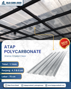 Atap polycarbonate adalah material atap berbahan plastik thermoplastik yang dikenal kuat, ringan, dan memiliki tingkat transparansi tinggi. Material ini menjadi pilihan populer untuk kebutuhan atap transparan karena mampu menghadirkan pencahayaan alami tanpa mengorbankan perlindungan dari cuaca.